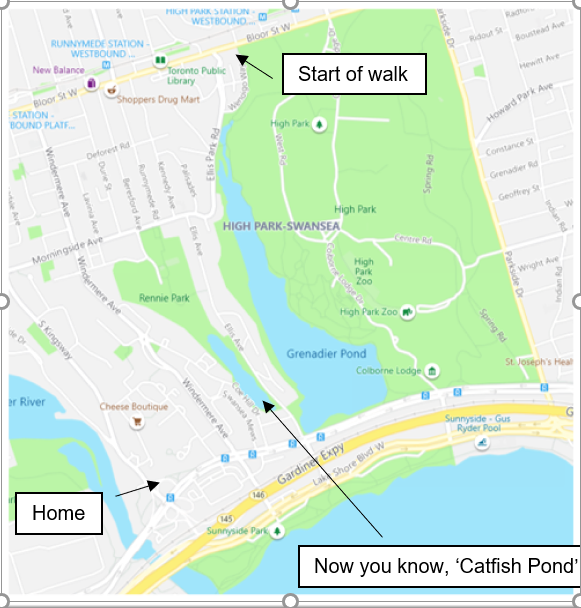 So I’ve added three kilometers to our walks. When Gord gets to read this I’m sure he’ll say with mock indignation, “Well, you really haven’t walked High Park,” which is what I hope he’ll say. Then we can get together again and he’ll show me the way.