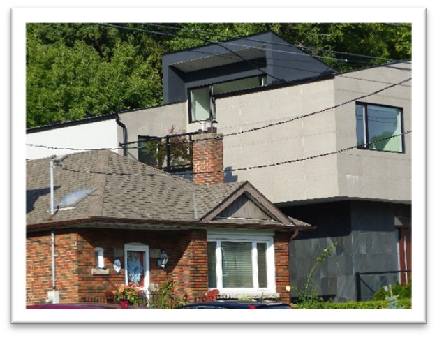Speaking of the small, this picture shows an-about-to-be-torn-down up against a neighbourly transformation. (The building to the right will soon lose not only the light-facing windows when the replacement McMansion surfaces and, I’m guessing, but also around $250,000 off any future listing.)