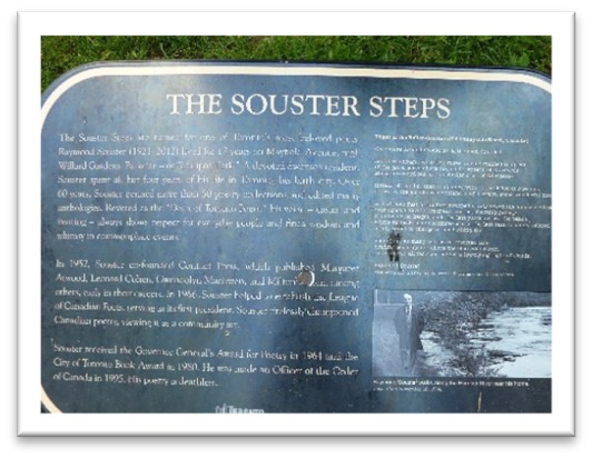 We start our descent down the Williard Walk and something new catches our eye, (Gord and I have a lot of important things to talk about that takes all our attention: ‘How are you feeling? How’s the dog? Pretty warm for this time of day, eh?” so it’s to be expected that we would miss the plaque honouring Raymond Holmes Souster, a recognized poet from the area and a supporter of the arts.